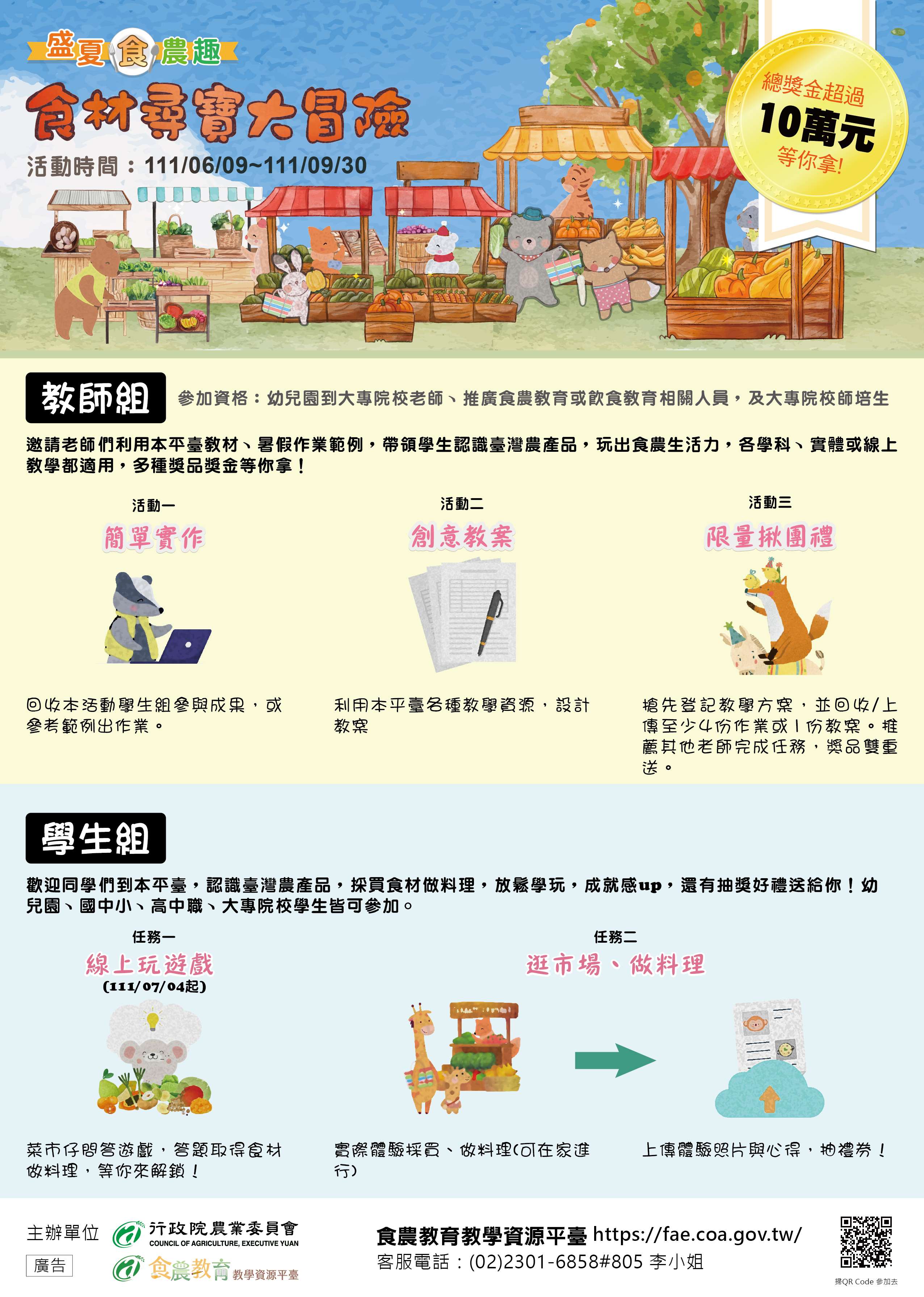 四、 為使大家孰悉平臺功能,該會舉辦「盛夏食農趣:食材尋寶大冒險」活動,總獎金超過10萬元,歡迎各級學校師生、食農老師踴躍參加。