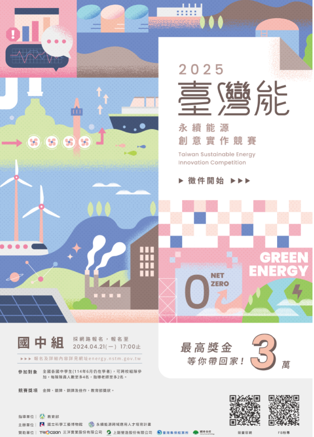 一、 為促進全國學生對「綠能科技」創新開發及推廣能源跨領域整合應用,國立科學工藝博物館與本部永續能源跨域應用人才培育計畫辦公室主辦旨揭競賽,期望學生發揮團隊想像力提出具體創意設計作品,提倡在生活中確實展開珍惜能源、愛護環境的行動。 二、 本競賽活動相關訊息如下: (一) 參賽對象:全國大專、高中職及國中學生。 (二) 本競賽限網路報名,報名時間即日起至114年4月21日下午5時止,詳細競賽辦法及內容請見網頁https://energy.nstm.gov.tw。