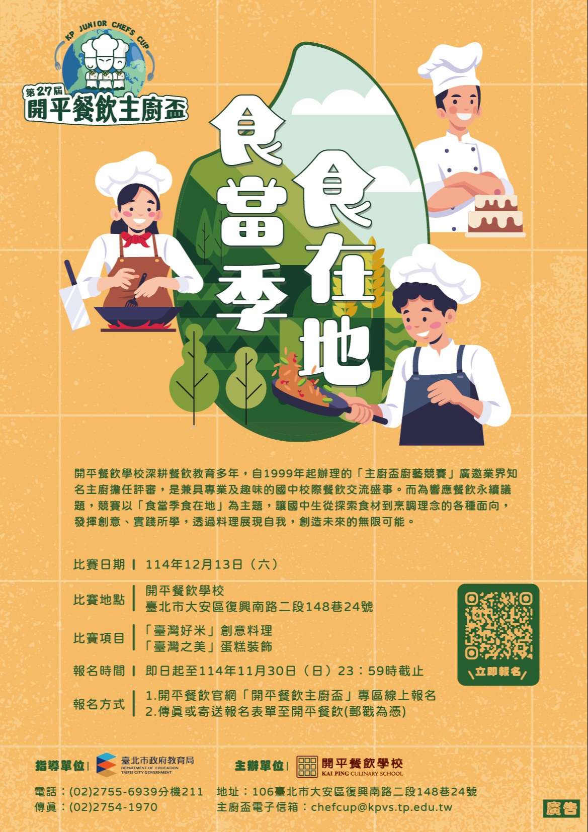主旨:檢送臺北市私立開平餐飲職業學校辦理「第27屆開平餐飲主廚盃創意烹飪比賽」競賽海報及評審名單,鼓勵學生踴躍報名參加。