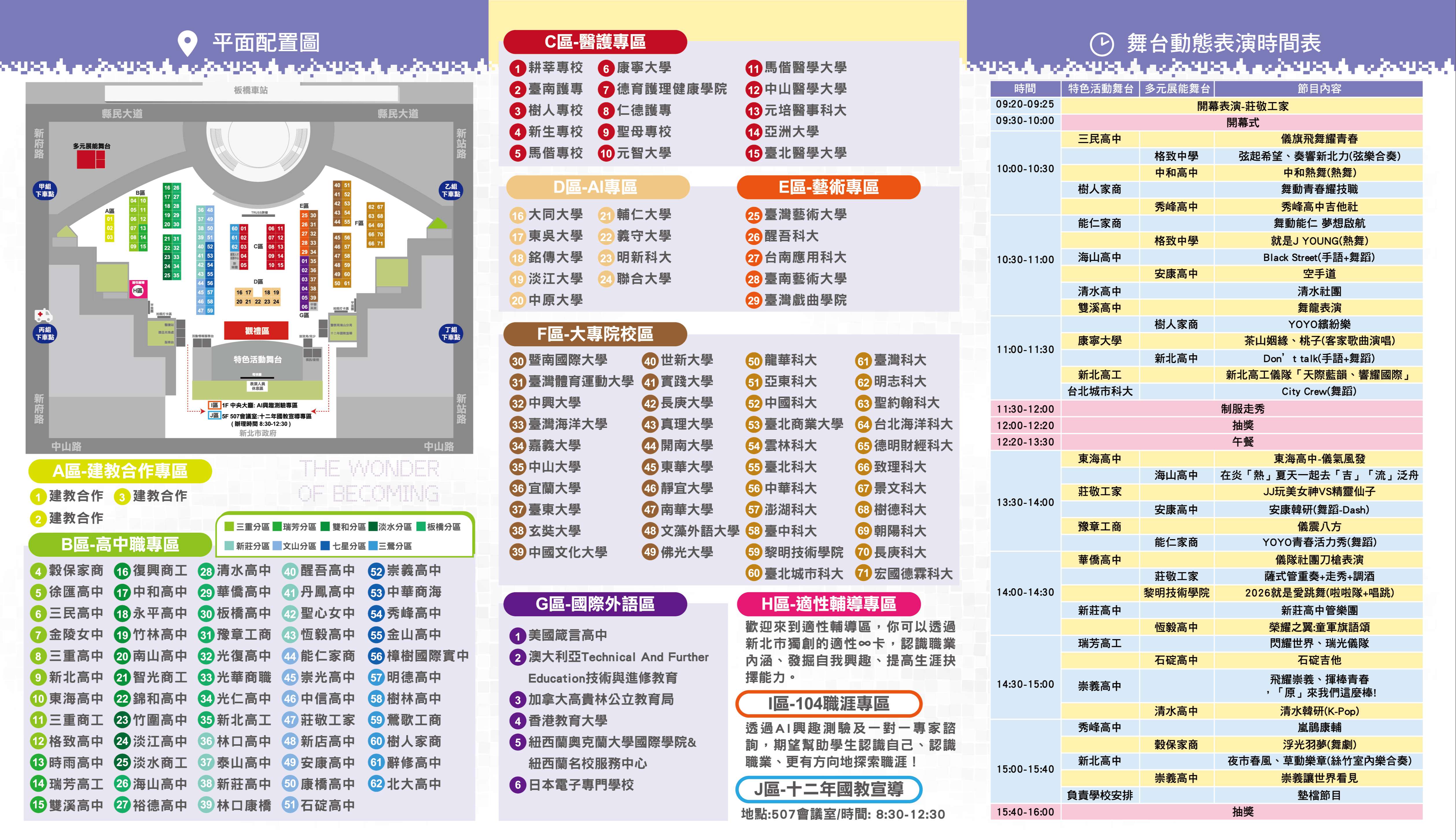 三、本次博覽會擴大邀請全國71所大專院校及60所新北市優質高中職學校參與,共有超過130所學校特色課程體驗,並設有十大專區體驗,涵蓋建教合作專區、高中職專區、醫護專區、AI專區、藝術專區、大專院校專區、國際外語專區、適性輔導專區、104職涯專區及十二年國教宣導專區等,另安排超過30個精彩的表演節目,歡迎北北基桃國高中學生及家長來現場參加,瞭解新北市優質高中職學校及大專院校特色。