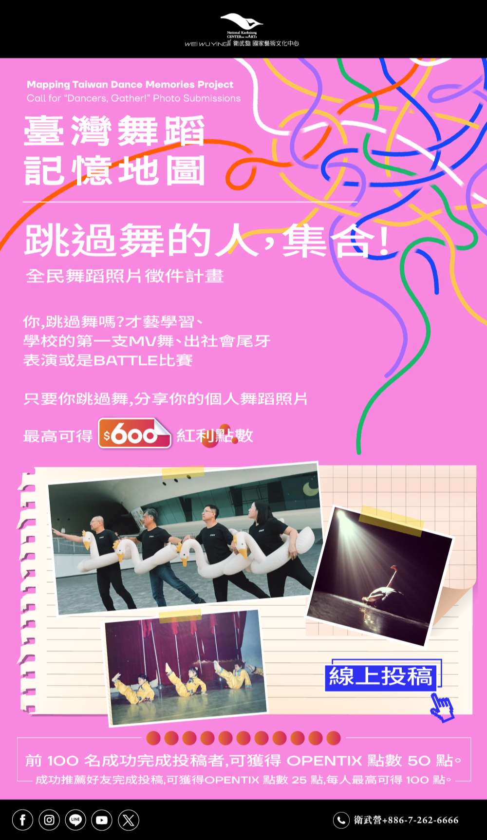 (二) 「跳過舞的人,集合!」全民舞蹈照片徵件活動參考簡章(如附件)或衛武營官網網址,邀請師生共同參與投稿,擴大舞蹈記憶之蒐集與交流。